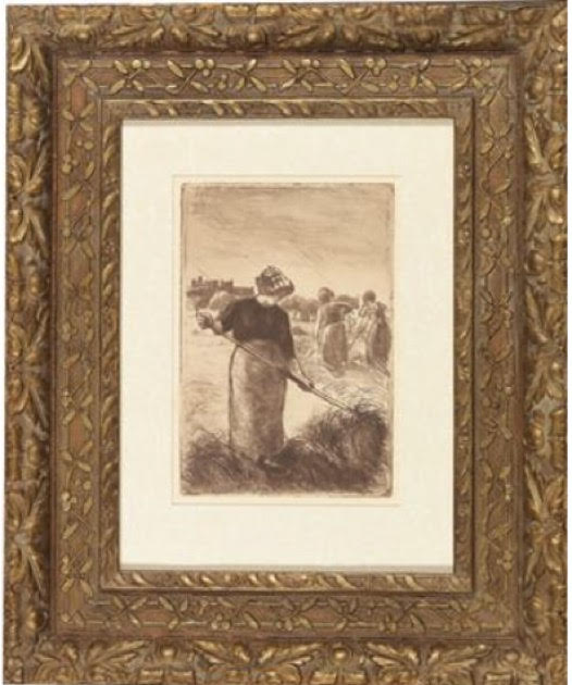 ・作品名 干し草を集める女性(原画)・技法 エッチング・サイン あり(右側)・額装 あり・サイズ 19.7 x 13.3 cm・制作年 1906・作品解説 フランスの印象派のカミーユ・ピサロ(Camille Pissarro, 1830–1903) による銅版画です。