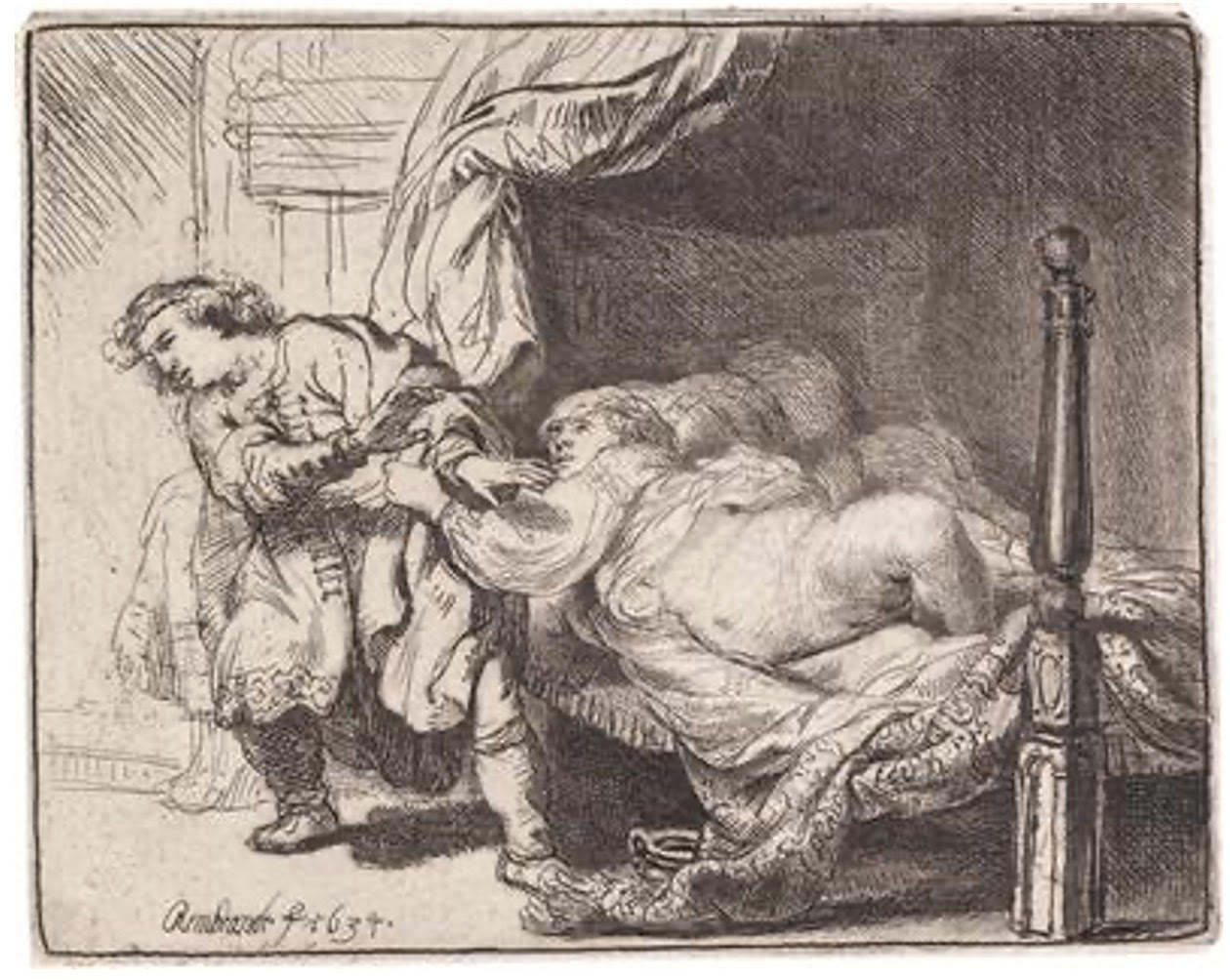 旧約聖書「創世記」に題材をとり、ポティファルの妻の誘惑を拒むヨセフの緊迫した一瞬を、卓越した線描と陰影で見事に表現しています。