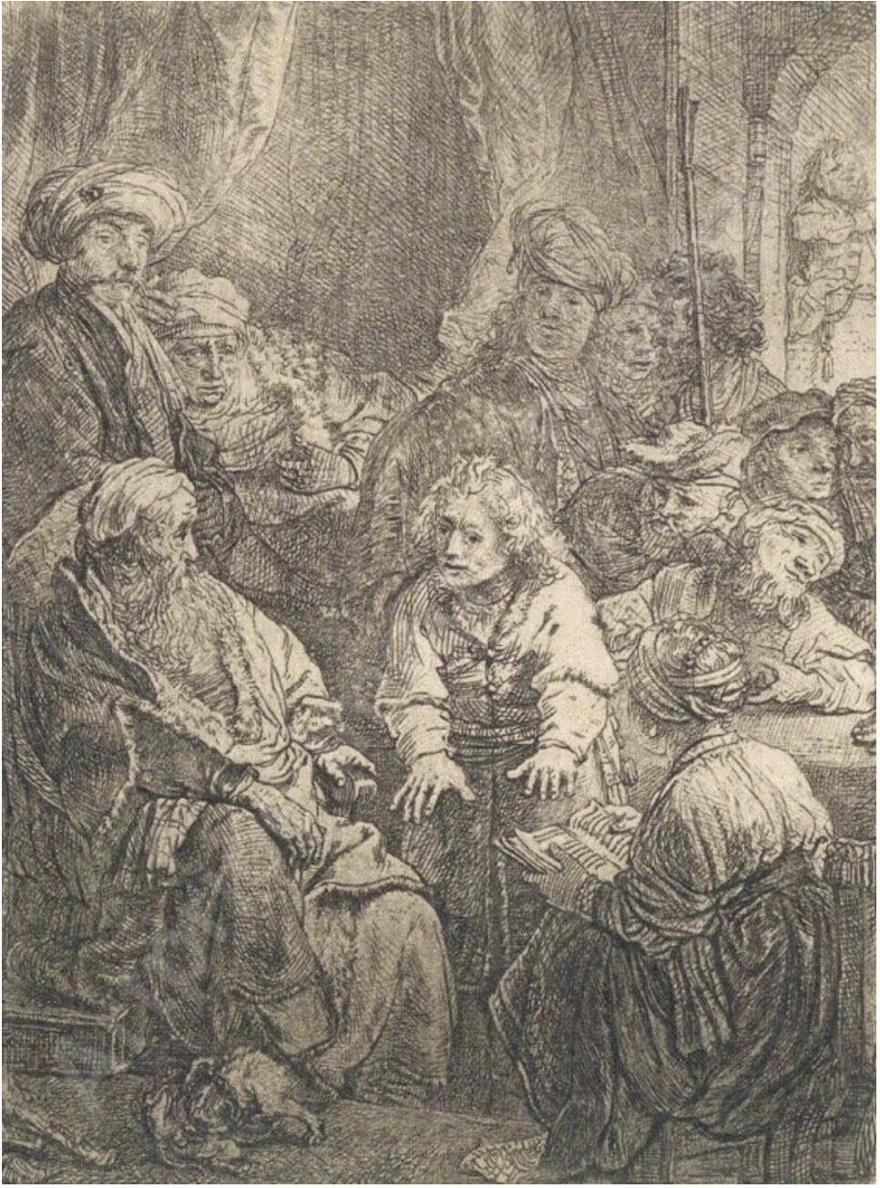 旧約聖書「創世記」に題材をとり、若きヨゼフが父ヤコブと兄弟たちを前に、後の運命を予示する夢を語る瞬間を捉えています。室内に集う人物たちの驚きや戸惑い、ヨゼフの確信めいた眼差しまでを、レンブラント特有の綿密な線描と陰影で生き生きと表現しています。